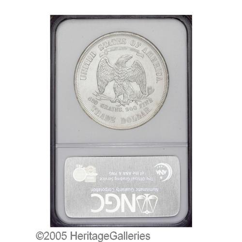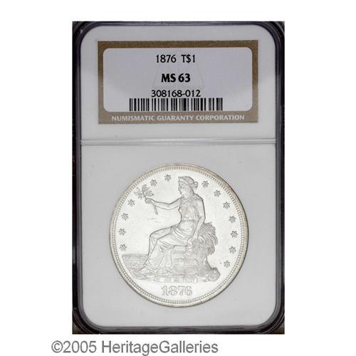 <B>1876<T$1> MS63 NGC.</B></I> Type One Obverse and Reverse. A lustrous, boldly struck, and nearly brilliant Select P-mint Trade Dollar. The reverse on its own challenges a higher grade, and the obverse is also clean except for a trio of small marks beneath the branch stem.
