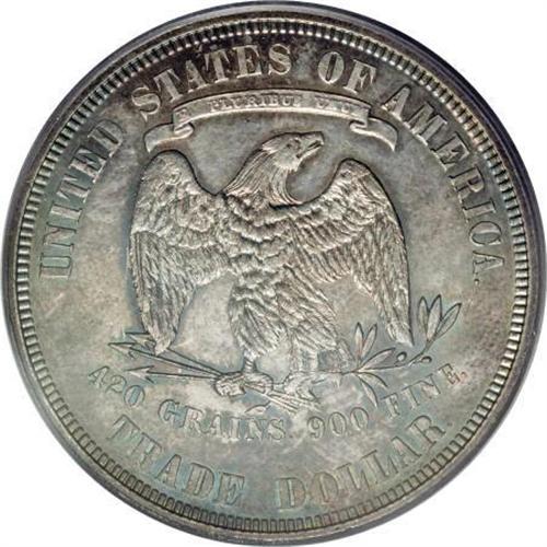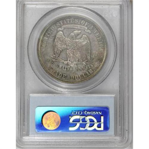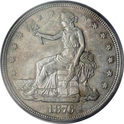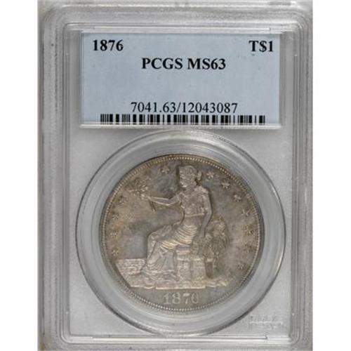<B>1876 T$1 MS63 PCGS.</B></I> Type One Obverse, Type Two Reverse. Wisps of olive-green adhere to light gray surfaces on the obverse of this Select Trade dollar, while the reverse takes on mauve-gray coloration with cobalt-blue in the recesses. Well struck, except for Liberty's hair and the upper stars. We note a few inoffensive obverse handling marks.<BR><BR><B>Coin Engraver:</B> William Barber<BR><BR><b>Shipping:</b> Coins & Currency (<a target="_blank" href="http://www.heritageauctions.com/common/shipping.php">view shipping information</a>)