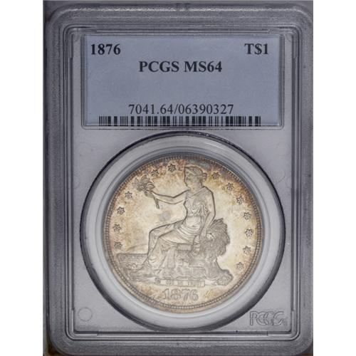 <B>1876<T$1> MS64 PCGS.</B></I> Type One Obverse and Reverse. Splendid golden-brown toning is especially prominent throughout the obverse border. A couple of aqua-blue dashes are present above Liberty's head. This thoroughly lustrous and lightly marked Centennial near-Gem has excellent eye appeal. UNITED STATES OF AMERICA is missing numerous serifs, an interesting feature caused by lapping of the reverse die during its production. <BR><BR><B>Important notice:</B> Heritage usually auctions material at the rate of 200-250 lots per hour. On some occasions eBay Live bid software or the Internet may not be able to keep up with the pace of the auction. We recommend placing a realistic absentee bid now as insurance to avoid disappointment. Occasionally the auctioneer may eliminate or reject an eBay Live bid, and the auctioneer may also reopen a lot after the close of the eBay live bidding (usually because we missed an audience bid), and may reject your bid even if it shows you as the winning bidder. By bidding via eBay Live, you agree that Heritage may award the lot to another bidder at its sole discretion under the circumstances described above or any other reasonable circumstances. Since eBay bids are not shown to us until we open the lot on the floor, we treat those bids just like floor bids. In most cases the floor responds before the eBay bid is presented to us, due to Internet lag time, so for consistency we have made it a policy that floor bids are always considered first over tie eBay live bids. Also please note that all Heritage lots purchased through eBay Live carry a 20% Buyer's Premium. Please make sure you read the Terms and Conditions before you bid. This lot is being auctioned in conjunction with a live floor auction by Heritage Galleries & Auctioneers. All final auction and invoice information will be supplied by Heritage Galleries & Auctioneers, and all other information should be considered preliminary. Lot:2223 <BR><BR><B>Winning Notification and Billing:</B> After the FINAL session in this auction is complete, Heritage will send e-mail and snail mail invoices. This process normally takes several days. All final auction and invoice information will be supplied by Heritage Galleries & Auctioneers, and all other information should be considered preliminary. <BR><BR>This auction will be conducted on a live auction floor and over the Internet through eBay Live. If you choose to place an absentee bid, please take a moment to <font color='#0000ff'><u><a href='http://pages.ebay.com/liveauctions/help/before/laabsentee.html'>learn how eBay Live absentee bidding works</a></u></font><font color='#000000'>