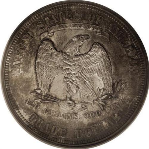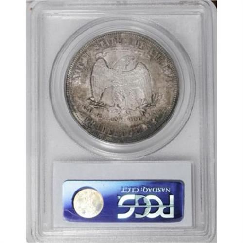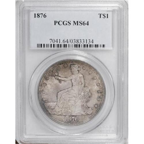 <B>1876 T$1 MS64 PCGS.</B></I> Type One obverse, Type Two reverse. The transitional variety that is seldom seen in any grade. This die combination is estimated to make up not more than 10% of all surviving 1876 Trade dollars. This piece is a remarkable example with heavy gold and steel toning over frosty silver luster. Fully struck on both obverse and reverse.<BR><BR><b>Shipping:</b> Coins & Currency (<a target="_blank" href="http://www.heritageauctions.com/common/shipping.php">view shipping information</a>)