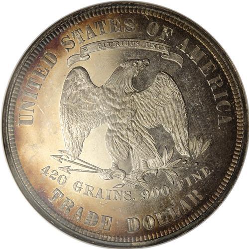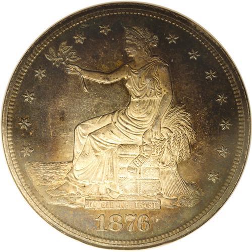 <B>1876<T$1> MS64 Prooflike NGC.</B></I> Type One Obverse, Type Two Reverse. This gorgeous near-Gem has almost certainly been sold as a proof in the past. The fields are flashy and watery, and the devices are delicately frosted. The peripheral blushes of peach, sea-green, and ruby-red proclaim the undeniable eye appeal. Curious raised die lines near the final stars are of mint origin.