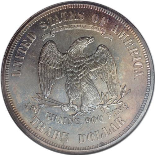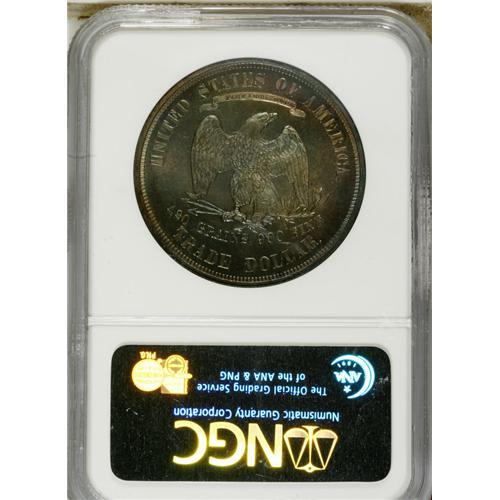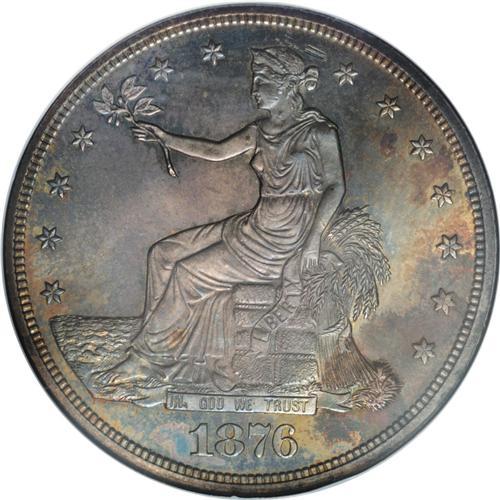 <B>1876 T$1 MS66 NGC.</B></I> Type One Obverse and Reverse. This lovely premium Gem displays excellent eye appeal, as it is awash in plum, sky-blue, golden-brown, and forest-green colors that are somewhat deeper on the obverse between 4 and 5 o'clock. Only the right (facing) claw lacks pinpoint definition. Well preserved, a trace of contact is seen on the upper right obverse, and the reverse is virtually pristine. The 1876 was apparently produced early in the year, since unlike the 1876-S issue, no Type Two obverses (with the scroll pointing down) are known. From the Type One hub reverse, present on a minority of this Centennial issue. Census: 4 in 66, none are finer (1/07).<BR><BR><b>Shipping:</b> Coins & Currency (<a target="_blank" href="http://www.heritageauctions.com/common/shipping.php">view shipping information</a>)