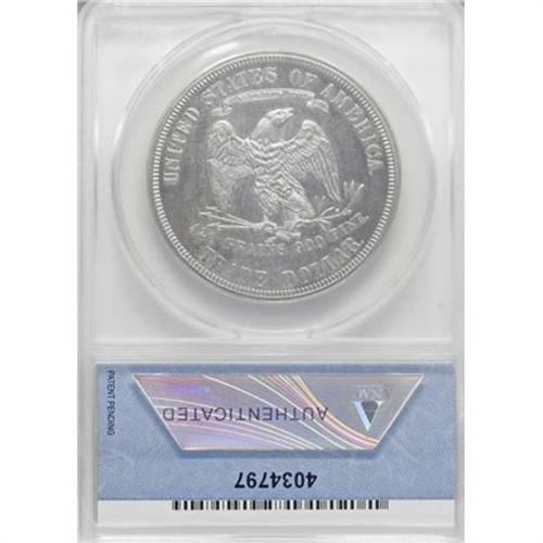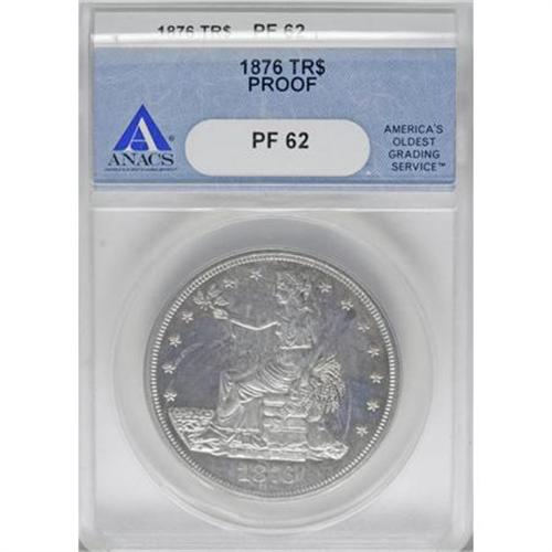 <B>1876 T$1 PR62 ANACS.</B></I> Type One Obverse, Type Two Reverse. The lower obverse ribbon end and nearby drapery folds exhibit minor die doubling. An intricately specimen and slightly hazy example that has a hint of frost throughout the devices.<BR><BR><B>Coin Engraver:</B> William Barber<BR><BR><b>Shipping:</b> Coins & Currency (<a target="_blank" href="http://www.heritageauctions.com/common/shipping.php">view shipping information</a>)