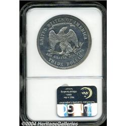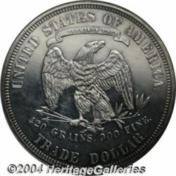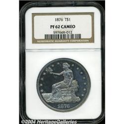 <B>1876<T$1> PR62 Cameo NGC.</B></I> Type One Obverse and Type Two Reverse. Trade dollars of 1876 are known from three different combinations of the two obverse and two reverse types. The majority of proof examples, in fact nearly all, are from the hub combination offered in the present lot. Among business strikes, however, this same combination is seldom seen. A lovely Cameo proof with deeply mirrored steel blue fields and lustrous silvery white devices. Light hairlines in the fields limit the grade of this centennial year issue. <BR><I>From The Barry Donnell Collection, Part Two.</B></I> <BR><BR><B>Important notice:</B> Heritage usually auctions material at the rate of 200-250 lots per hour. On some occasions eBay Live bid software or the Internet may not be able to keep up with the pace of the auction. We recommend placing a realistic absentee bid now as insurance to avoid disappointment. Occasionally the auctioneer may eliminate or reject an eBay Live bid, and the auctioneer may also reopen a lot after the close of the eBay live bidding (usually because we missed an audience bid), and may reject your bid even if it shows you as the winning bidder. By bidding via eBay Live, you agree that Heritage may award the lot to another bidder at its sole discretion under the circumstances described above or any other reasonable circumstances. Since eBay bids are not shown to us until we open the lot on the floor, we treat those bids just like floor bids. In most cases the floor responds before the eBay bid is presented to us, due to Internet lag time, so for consistency we have made it a policy that floor bids are always considered first over tie eBay live bids. Also please note that all Heritage lots purchased through eBay Live carry a 20% Buyer's Premium. Please make sure you read the Terms and Conditions before you bid. </span></font></tr></table></td></tr></table>