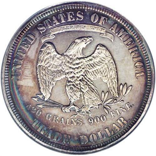 <B>1876<T$1> PR63 Cameo ANACS.</B></I> Type One Obverse, Type Two Reverse. Lovely hazel-green and orange toning grace the peripheries of this flashy specimen. Crisply struck aside from the eagle's right (facing) claw. Frosty devices confirm the Cameo designation. Hairlines are seen near UNITED and Liberty's waist. PLURIBUS UNUM is lightly die doubled north.