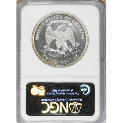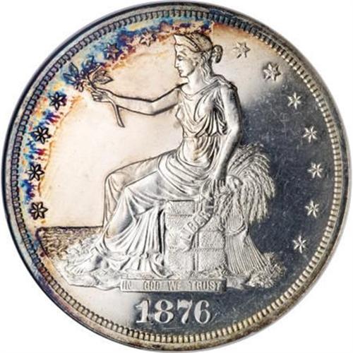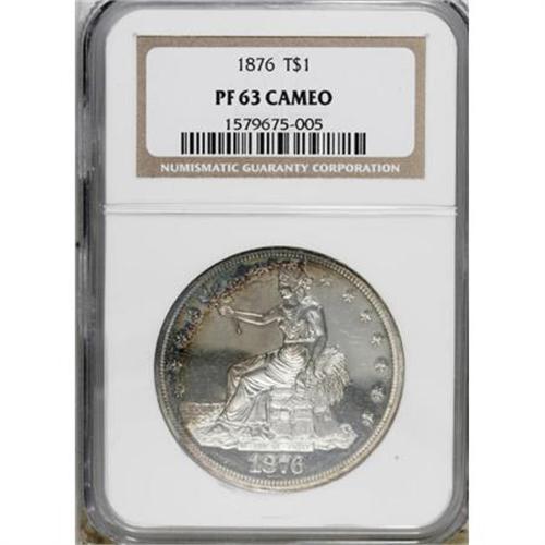 <B>1876 T$1 PR63 Cameo NGC.</B></I> Type One Obverse, Type Two Reverse. The proofs of 1876 are notable for variety collectors as they are available in all four obverse/reverse combinations. The I/II combination seen here is the most frequently encountered. Lightly hairlined, the surfaces are brilliant over most of each side with a light ring of golden and blue around the obverse periphery and just a touch of golden over the denticles on the reverse.<BR><BR><b>Shipping:</b> Coins & Currency (<a target="_blank" href="http://www.heritageauctions.com/common/shipping.php">view shipping information</a>)