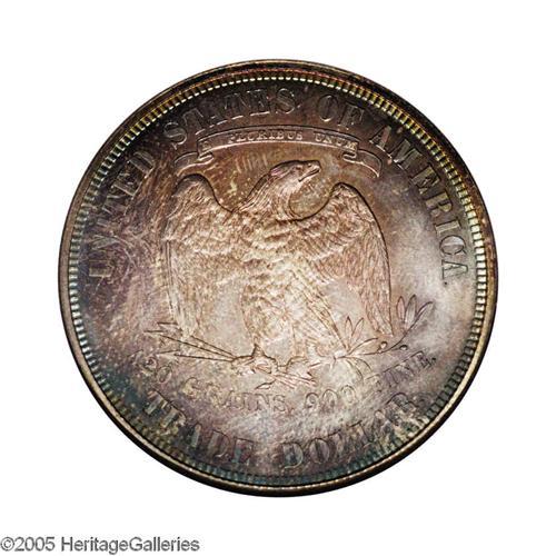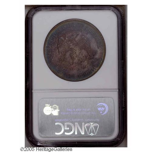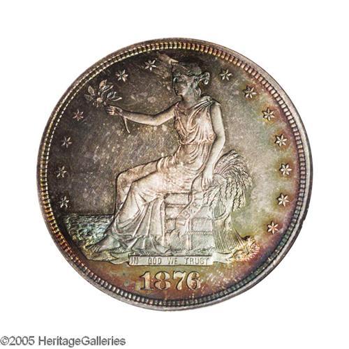 <B>1876<T$1> PR65 NGC.</B></I> Type Two Obverse and Reverse. Spectacular ruby-red, aqua, electric-blue, gold, and mauve colors endow this carefully preserved Gem. A nicely struck representative that would make a splendid addition to a toned silver proof type set. 1,150 pieces were struck, a few hundred more than the issues of surrounding years, perhaps due to sales at the Centennial exposition held that year in Philadelphia. Bowers (1992) stated that the Type Two Obverse and Reverse hub combination on proofs of this date is "Possibly five or more times rarer than Proofs of I/II." An opportunity for the alert specialist.