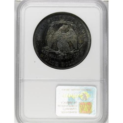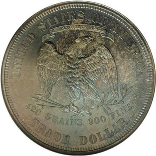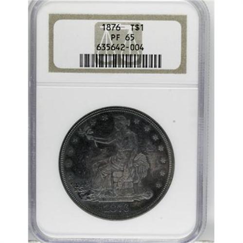 <B>1876 T$1 PR65 PCGS.</B></I> Type Two Obverse and Reverse. Our auction records suggest that less than one in three proof 1876 Trade dollars has a Type Two obverse, identified by the lower scroll end, which points down rather than to the left. Proofs were sold at the Mint booth at the Philadelphia Centennial Exposition, contributing to an above average proof mintage of 1,150 pieces. The present mark-free specimen has dusky aquamarine and rose-gray toning. Well struck save for the right (facing) claw.<BR><BR><b>Shipping:</b> Coins & Currency (<a target="_blank" href="http://www.heritageauctions.com/common/shipping.php">view shipping information</a>)