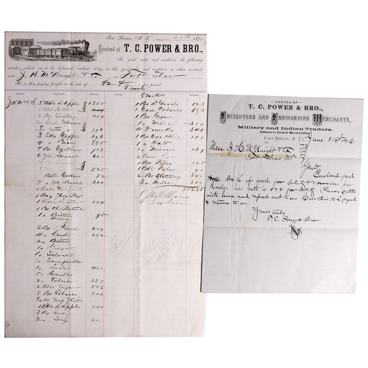 Lot of 2. 1) T.C. Power & Bro., Freighters and Forwarding Merchants, Military and Indian Traders, Fort Benton, Montana Territory. Letter of account paid in full issued to Mess. J.W. McKnight & Co., Fort Shaw, Montana Territory. With slight staining to left upper crease. 8" x 10". 2) Bill of exchange issued to J.W. McKnight for a list of 47 goods including coffee, saddlery, tobacco, sarsaparilla, etc. With vignette of train pulling from station. Slight tear at left of center crease. 10" x 15". Montana was still a wilderness in 1860 and Fort Benton was the only outpost east of the Rockies where there was settlement. Fort Benton later became a part of Chouteau County, named after Charles P. Chouteau, an early fur trader associated with the Fort Benton outpost [Sanders, Helen Fitzgerald, 1913].