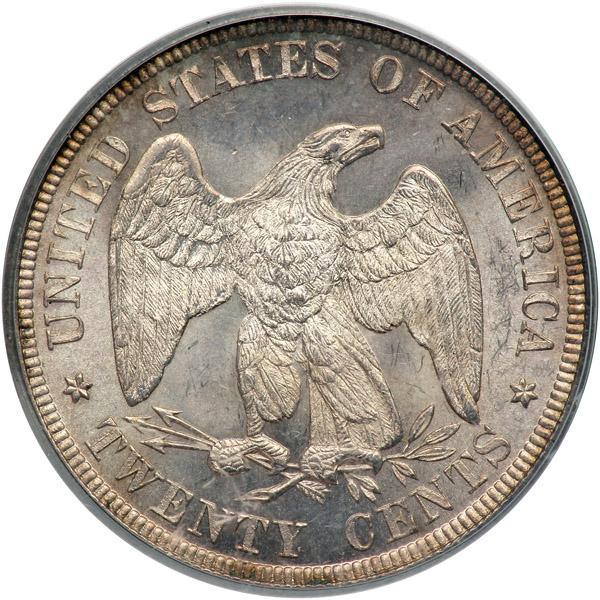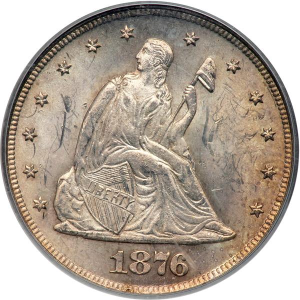 1876 Twenty Cents. PCGS graded MS-63. Well struck with frosty lustrous surfaces throught. A touch of light golden toning adds to its appeal. Mintage of only 14,640 struck. Pop 58; 107 finer (PCGS # 5299) .