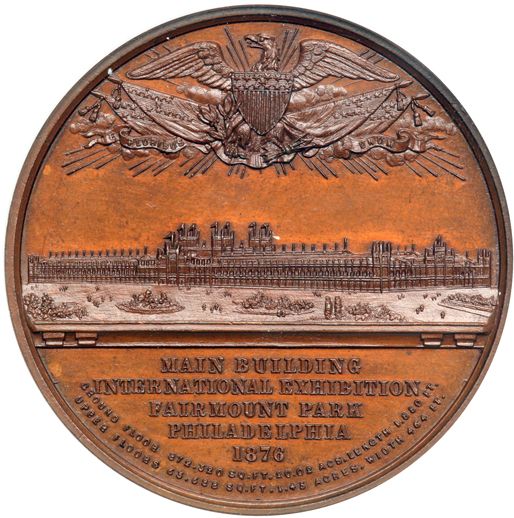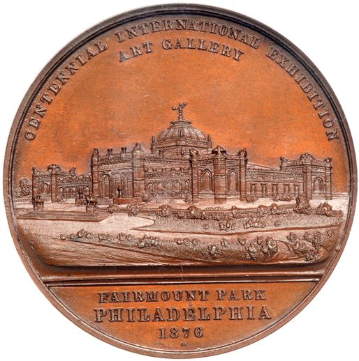 1876 U.S. Centennial Exposition, Main & Art Gallery Building. NGC MS-66. NGC graded MS-66. Bronze, 51.5mm. An exceptional, red and brown, mahogany bronze commemorative medal from the Centennial International Exposition in Philadelphia. With the Art Gallery building on the obverse and main building/exposition view on the reverse. Both in high relief.