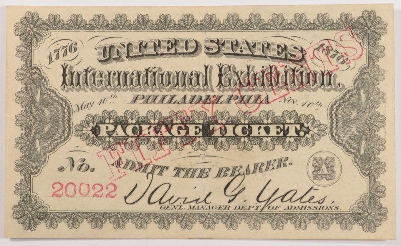 1876 US INTERNATIONAL EXHIBITION TICKET CU (RED OVERPRINT & SERIAL)