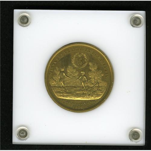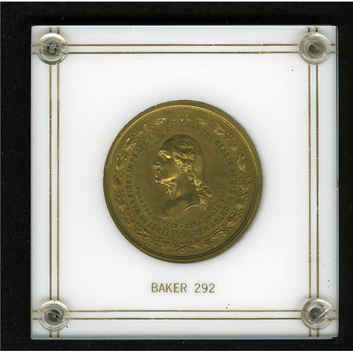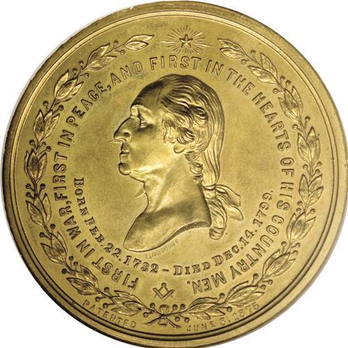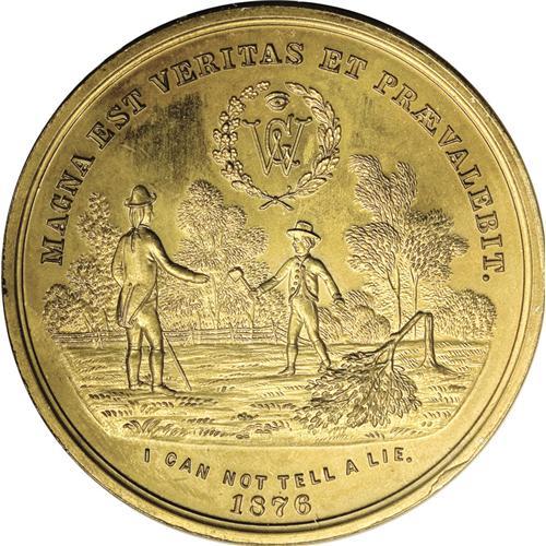 <B>1876 Washington Magna Est Veritas Medal, Baker-292C, PR64 Uncertified.</B></I> Brass. Designed by Rudolph Laubenheimer for the 1876 Centennial, this Masonic medal is popular for its reverse that shows a young Washington next to a chopped-down cherry tree with the words "I Can Not Tell A Lie" below. This large medal shows a bright, undimmed surface with a slight iridescent overlay of patina.<BR><I>Ex: Phillip Flannagan Collection (Bowers and Merena, 11/01), lot 5382.</B></I>