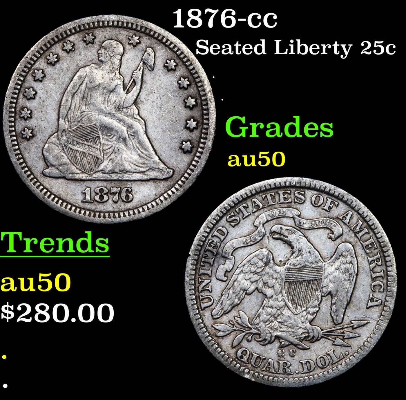 1876-cc Seated Liberty Quarter 25c Grades AU, Almost Unc.