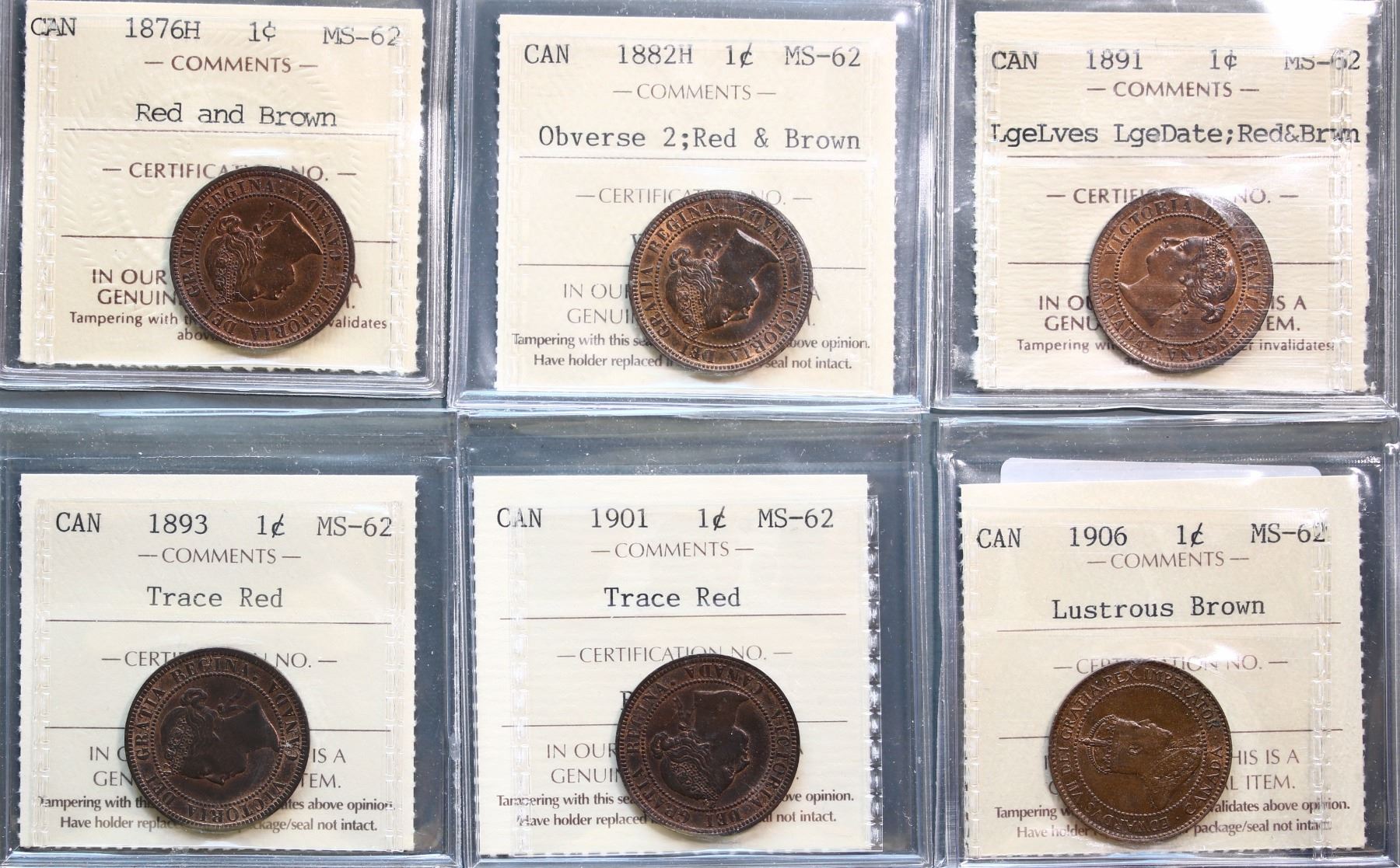 1876H 1¢, 1882H Obv 2, 1891 LDLL, 1893, 1901, and 1906, all ICCS Choice Mint State-62RB, lot of 6 co