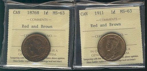 1876H 1¢ & 1911 ICCS MS63RB. Lot of 2 coins.