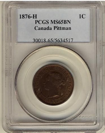 1876H 1¢ PCGS MS65BN. Pittman example with light traces of red.