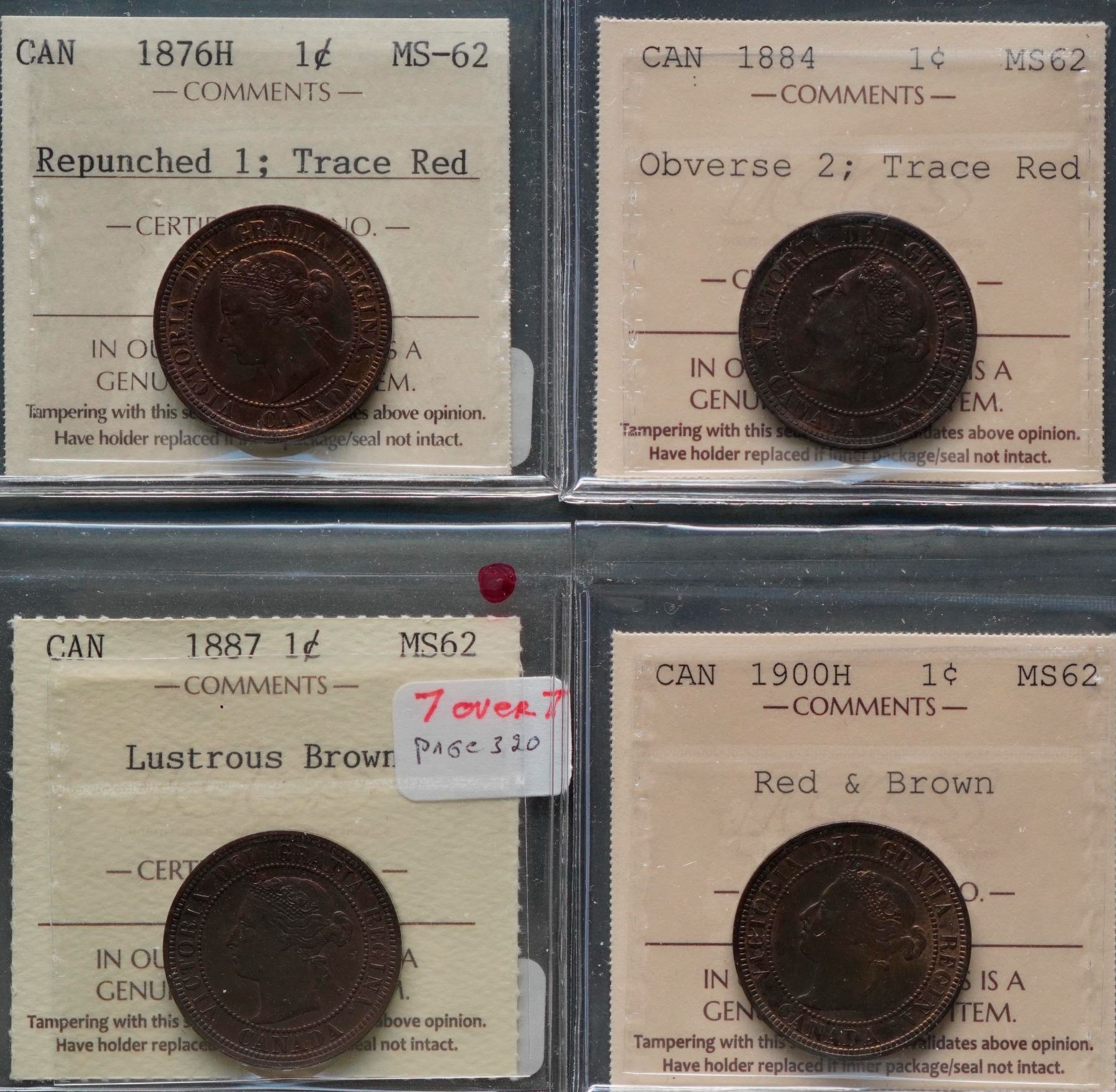 1876H 1¢ RP-1, 1884 Obv 2, 1887 (7/7) & 1900H all ICCS Choice Mint State-62. Lot of 4 coins.