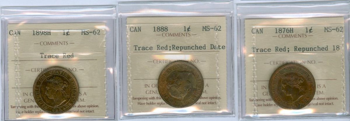 1876H, 1888 & 1898H 1¢. Lot of three ICCS MS62 coins. All three coins designates as Trace Red and the 1888 shows re-punched date.