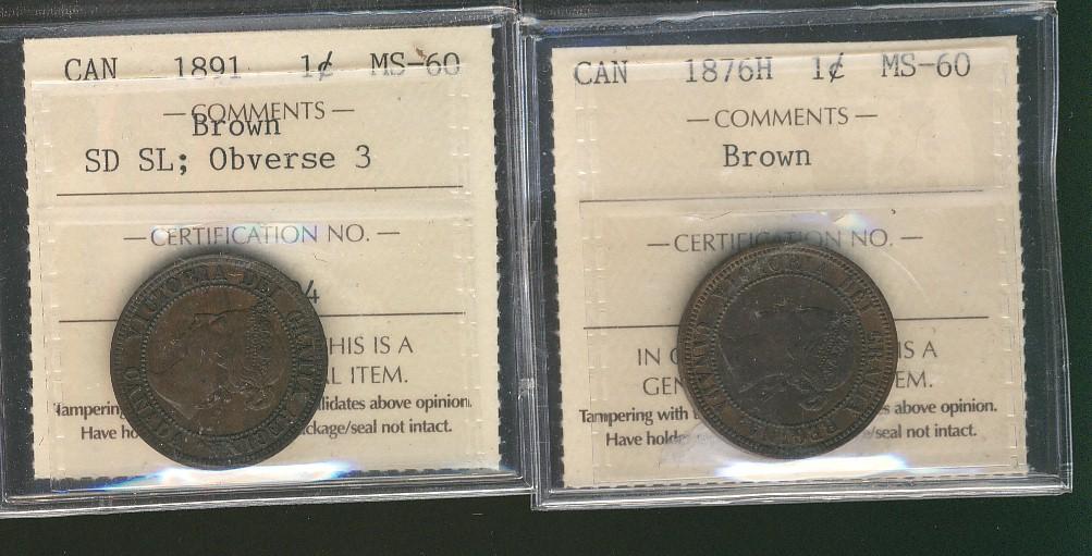 1876H & 1891 1¢ SDSL Obv 3 ICCS MS60BN. Lot of 2 coins.