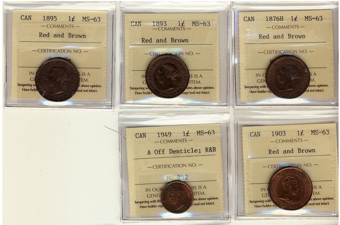 1876H, 1893, 1895, 1903 & 1949 A Off Dent 1¢ ICCS MS63RB. Lot of 5 coins.