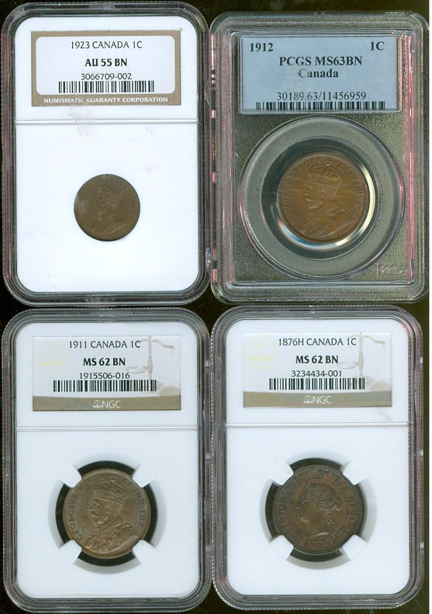 1876H, 1911 1¢ NGC MS62BN,1912 PCGS MS63BN & 1923 1¢ NGC AU55BN. Lot of 4 coins all certified.