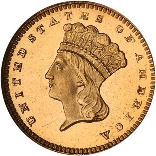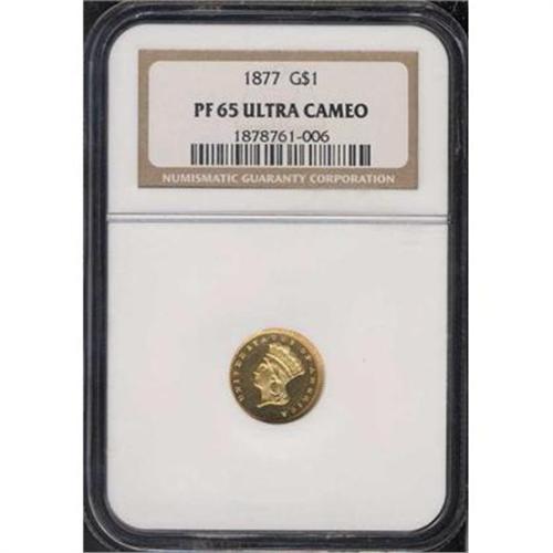 <b>1877 $1 Gold Indian. NGC graded PF65 UC.</b> NGC Pop: 1/2. Identifiable by one faint hairline in the field between U of UNITED and the lower neck. A glittering and fiery gem with nicely frosted motifs surrounded by deeply mirrored fields that display lovely light orange highlights. This beautiful gem survivor from a reported Proof mintage of 20 coins (though some in the numismatic community believe that 30 or so were actually made). In the neighborhood of 15 to 20 Proofs can be accounted for today, which lends credence to the higher number. The present gem is, without question, and we note this with pride, among the finest Proof 1877 gold dollars certified by either service. A grand opportunity to obtain a prized rarity at the height of quality.