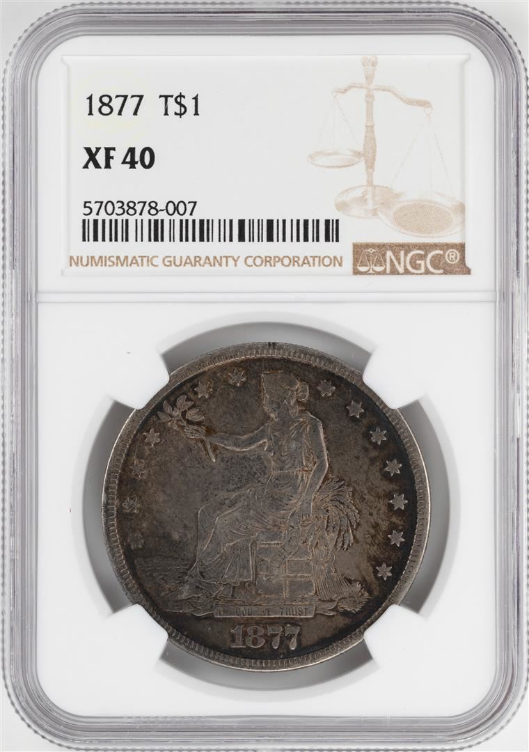 One 1877 $1 Trade Silver Dollar Coin NGC XF40. NGC Certified.