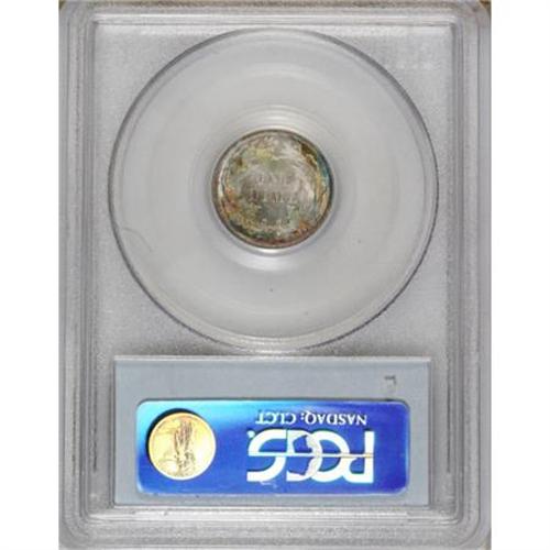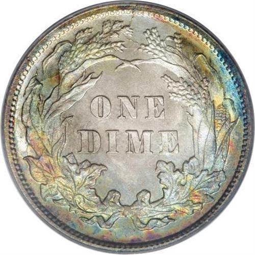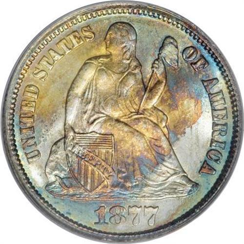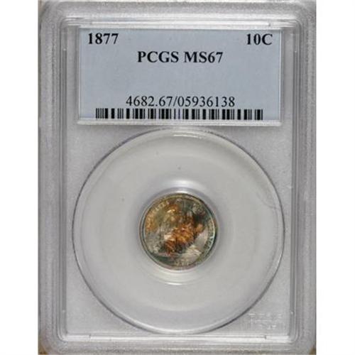 <B>1877 10C MS67 PCGS.</B></I> The more commonly seen Type Two reverse, attributed by the E in ONE being distant from the wreath. Highly lustrous surfaces display, on the obverse, waves of medium intensity golden-brown, cobalt-blue, and lavender, and pastel violet, sky-blue, and gold-yellow on the reverse. An attentive strike yields well defined and uniform definition on the design features. Impeccably preserved throughout. Population: 4 in 67, 0 finer (6/07).<BR><BR><b>Shipping:</b> Coins & Currency (<a target="_blank" href="http://www.heritageauctions.com/common/shipping.php">view shipping information</a>)