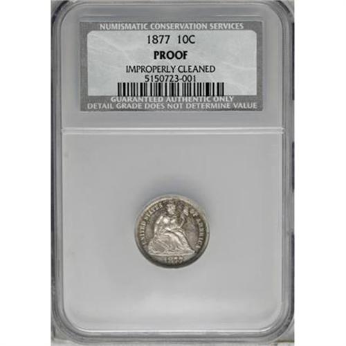 <B>1877 10C --Improperly Cleaned--NCS. Proof.</B></I> NGC Census: (2/88). PCGS Population (4/126). Mintage: 510. Numismedia Wsl. Price for NGC/PCGS coin in PR60: $220. (#4774)<BR><BR><B>Coin Engraver:</B> Christian Gobrecht<BR><BR><b>Shipping:</b> Coins & Currency (<a target="_blank" href="http://www.heritageauctions.com/common/shipping.php">view shipping information</a>)