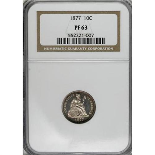 <B>1877 10C PR63 NGC.</B></I> NGC Census: (18/56). PCGS Population (39/42). Mintage: 510. Numismedia Wsl. Price for NGC/PCGS coin in PR63: $350. (#4774)<BR><BR><B>Coin Engraver:</B> Christian Gobrecht<BR><BR><b>Shipping:</b> Coins & Currency (<a target="_blank" href="http://www.heritageauctions.com/common/shipping.php">view shipping information</a>)