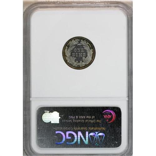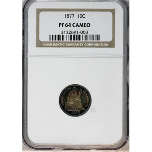 <B>1877 10C PR64 Cameo NGC.</B></I> Deep blue-green patina drapes the obverse margins, while the center of that side and the reverse peripheries show elements of orange. Essentially untoned elsewhere with moderate contrast and excellent eye appeal. Census: 4 in 64 Cameo, 3 finer (1/08).<BR><BR><b>Shipping:</b> Coins & Currency (<a target="_blank" href="http://www.heritageauctions.com/common/shipping.php">view shipping information</a>)