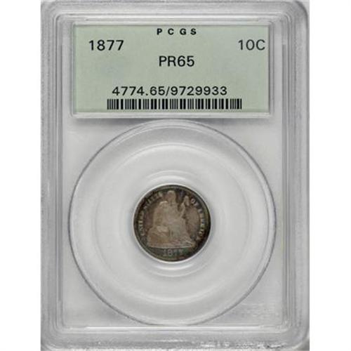 <B>1877 10C PR65 PCGS.</B></I> After the spike in proof production brought on by the nation's centennial, the mintage fell for 1877, with just 510 pieces struck. This lovely Gem offers delightful golden toning at the margins and centers with a measure of periwinkle-blue in between. Population: 11 in 65, 7 finer (10/07).<BR><BR><B>Coin Engraver:</B> Christian Gobrecht<BR><BR><b>Shipping:</b> Coins & Currency (<a target="_blank" href="http://www.heritageauctions.com/common/shipping.php">view shipping information</a>)