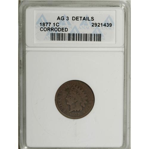 <B>1877 1C --Corroded--ANACS. AG3 Details.</B></I> NGC Census: (0/1622). PCGS Population (100/1768). Mintage: 852,500. (#2127)<BR><BR><b>Shipping:</b> Coin/Currency (<a target="_blank" href="http://www.heritageauctions.com/common/shipping.php">view shipping information</a>)