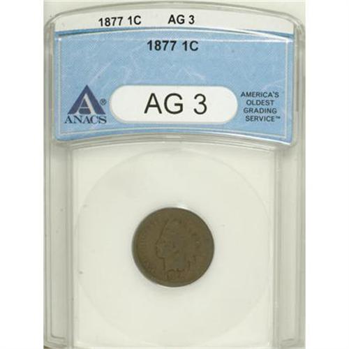 <B>1877 1C AG3 ANACS.</B></I> The date is bold, and the chocolate-brown surfaces are void of distractions. A few letters in STATES OF AMERICA are worn smooth, but the shield lines have some definition. The series key.<BR><BR><B>Coin Engraver:</B> James B. Longacre<BR><BR><b>Shipping:</b> Coins & Currency (<a target="_blank" href="http://www.heritageauctions.com/common/shipping.php">view shipping information</a>)
