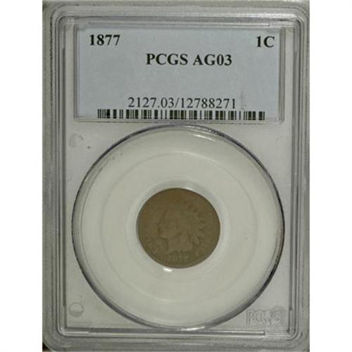 <B>1877 1C AG3 PCGS.</B></I> Despite heavy wear that extends to the tops of the obverse lettering, the date is clear on this deep brown example. No distracting marks are present on the surfaces of this Indian cent key.<BR><BR><B>Coin Engraver:</B> James B. Longacre<BR><BR><b>Shipping:</b> Coins & Currency (<a target="_blank" href="http://www.heritageauctions.com/common/shipping.php">view shipping information</a>)