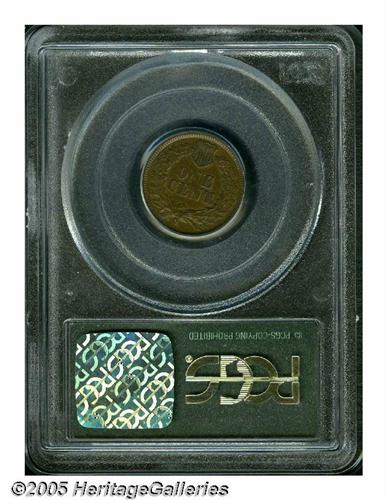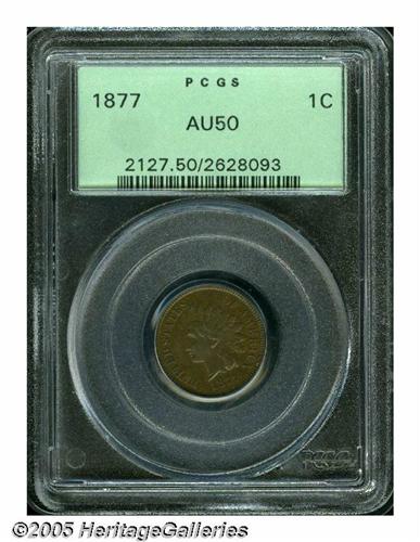 <B>1877<1C> AU50 PCGS.</B></I> Warm light to medium brown surfaces exhibit accents of sky-blue on the obverse. The design elements are relatively well defined. The upper and lower diamonds show, and the two middle ones exhibit partial definition. A few minor contact marks and pinscratches are visible on the Indian's cheek and neck.