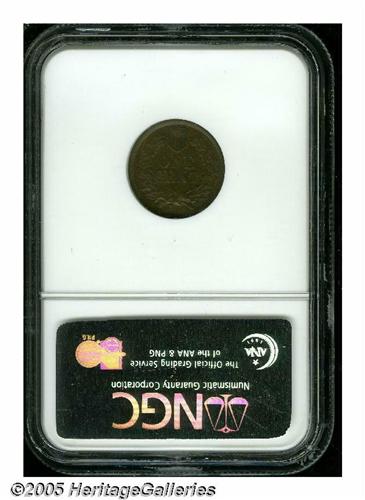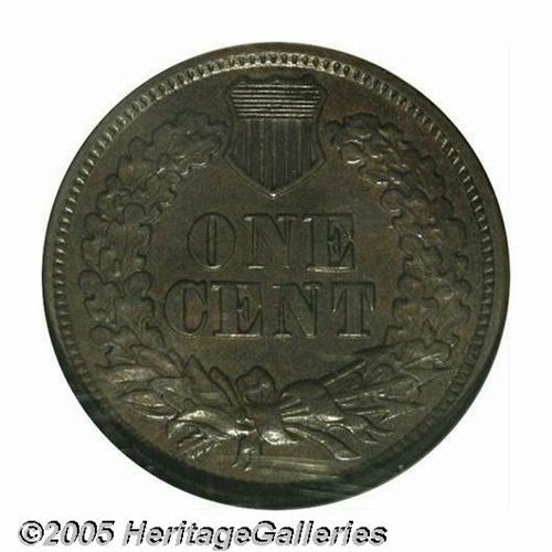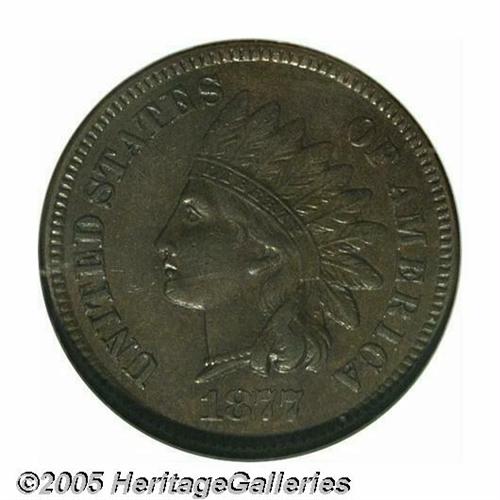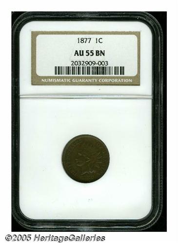 <B>1877<1C> AU55 NGC.</B></I> An exceedingly well detailed Choice AU example, the surfaces are remarkably clean, and the medium-brown coloration is very evenly displayed over both obverse and reverse. The collector of this popular series would be hard-pressed to locate a more pleasing, defect-free example of the famous 1877 Indian Cent, for the grade.