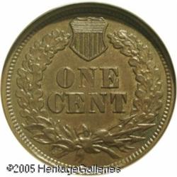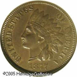 <B>1877 1C AU58 NGC.</B></I> This should prove to be a popular coin in the auction. The surfaces are carbon-free and the color is a deep brown, evenly spread over both sides. The striking details are strong throughout--except of course on the bottom of the N in ONE--a diagnostic of genuine 1877 cents. An exceptional near-mint example of this rare, key date issue. Lot:5227
