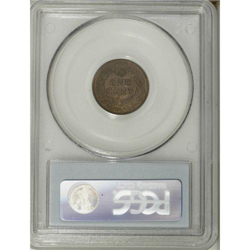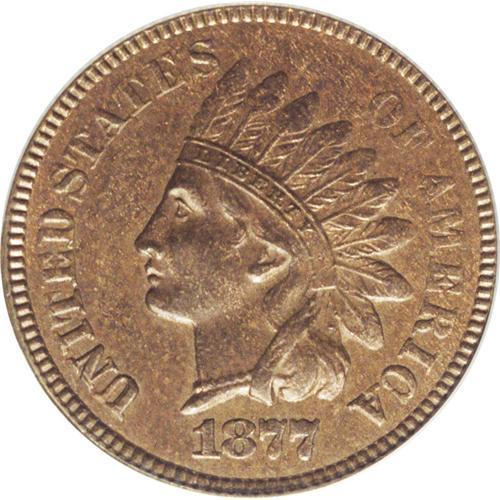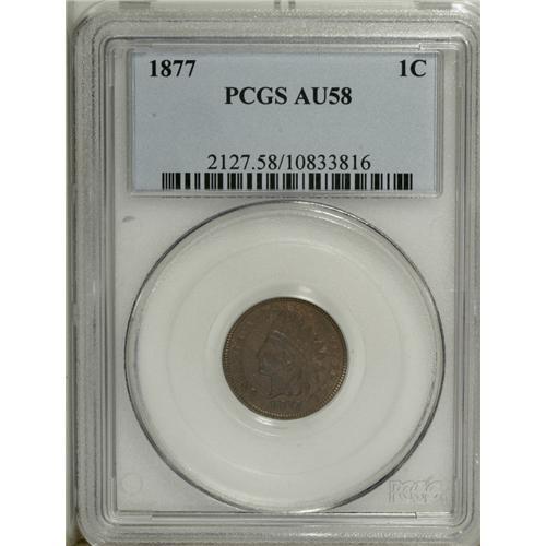 <B>1877 1C AU58 PCGS.</B></I> Pleasing medium brown surfaces with flecks of gold and hints of original red color. This is an attractive example of the key-date to the Indian cent series with excellent surfaces for the grade. It is not fully struck, although the diamonds are sharp and the shield lines are complete.<BR><BR><b>Shipping:</b> Coin/Currency (<a target="_blank" href="http://www.heritageauctions.com/common/shipping.php">view shipping information</a>)