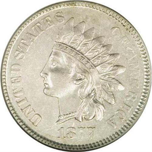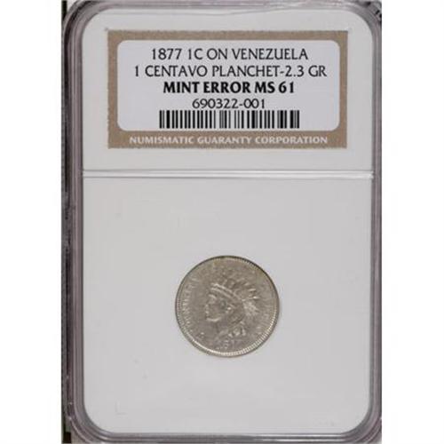 <B>1877 1C Indian Cent--Struck on a Venezuela One Centavo Planchet--MS61 NGC.</B></I> 2.3 gm. Judd-1496, Pollock-1649, R.8. Not a true pattern but a mint error, this fascinating piece made its way into the two major pattern references due to its appearance, which is suggestive of a deliberately struck off-metal pattern. Later research revealed the truth, though the most recent edition of Judd maintains the listing for this singular item. While the Philadelphia Mint did not strike any contract coinage for Venezuela in 1877, a legacy copper-nickel planchet from the previous year's production of one centavo coins somehow mixed in with the bronze blanks for cents and was struck. The result was this fascinating specimen.<BR> The feathers of the headdress are weak at the tips, owing to the underweight nature of the planchet, and the lower part of the wreath is similarly ill-defined. By contrast, the soft lower right corner of the N in ONE is a diagnostic for this important issue. Occasional sage accents grace the otherwise nickel-gray surfaces.<BR> Any Uncirculated 1877 cent is highly desirable due to its status as a low mintage key date. Finding such an example struck on a foreign planchet is an opportunity unlikely to surface again.<BR><I>Ex: Bowers and Merena 2003 Baltimore ANA Auction, lot 3158.</B></I><BR><BR><B>Coin Engraver:</B> James B. Longacre<BR><BR><b>Shipping:</b> Coins & Currency (<a target="_blank" href="http://www.heritageauctions.com/common/shipping.php">view shipping information</a>)