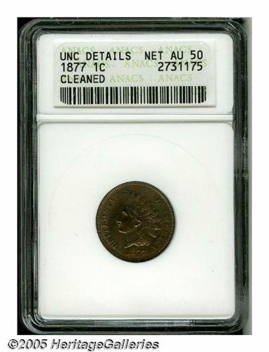 <B>1877<1C>--Cleaned--ANACS. Unc Details, Net AU50.</B></I> This key date example has unnaturally bright surfaces that have retoned golden-tan, sky-blue, and crimson. Well detailed, though a couple of the diamonds are weak. A few light contact marks are scattered over the obverse.