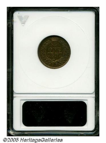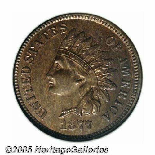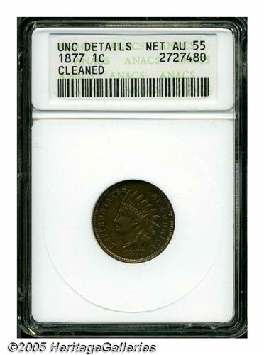 <B>1877<1C>--Cleaned--ANACS. Unc Details, Net AU55.</B></I> A glossy piece with a sharp strike and bright gold and olive hues. A trivial toning fleck near the E in UNITED is accompanied by faint pinscratches. Struck from a multiply clashed reverse die.