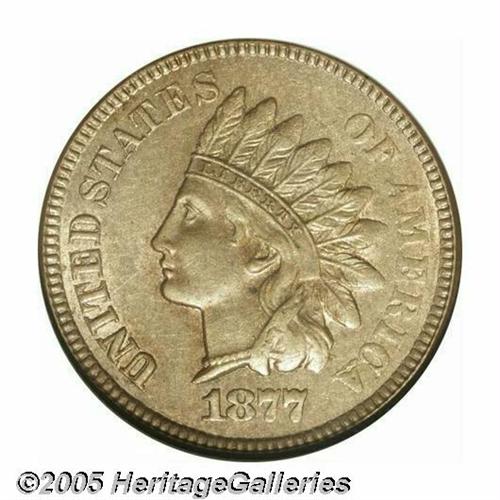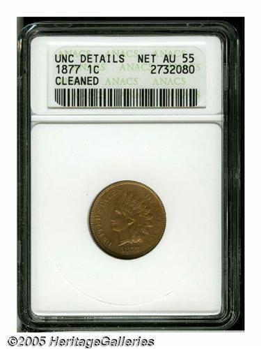 <B>1877<1C>--Cleaned--ANACS. Unc Details, Net AU55.</B></I> The striking details show even softness over the highpoints and the surfaces overall are unnaturally light in color from cleaning. The only surface flaw of note is a single spot of carbon below Liberty's ear.