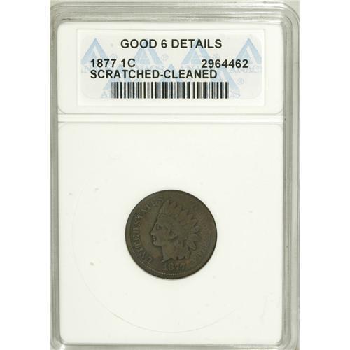<B>1877 1C --Cleaned, Scratched--ANACS. Good 6 Details.</B></I> NGC Census: (0/1457). PCGS Population (215/1354). Mintage: 852,500. Numismedia Wsl. Price for NGC/PCGS coin in G6 : $623. (#2127)<BR><BR><b>Shipping:</b> Coins & Currency (<a target="_blank" href="http://www.heritageauctions.com/common/shipping.php">view shipping information</a>)