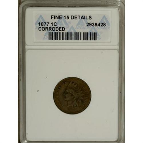 <B>1877 1C --Corroded--ANACS. Fine 15 Details.</B></I> This medium-brown example shows fine corrosion on both sides, but there are no singular impairments or heavy contact otherwise. Several letters in LIBERTY are still visible on the obverse. An affordable example of this key date, a bit better in appearance than it sounds.<BR><BR><B>Coin Engraver:</B> James B. Longacre<BR><BR><b>Shipping:</b> Coins & Currency (<a target="_blank" href="http://www.heritageauctions.com/common/shipping.php">view shipping information</a>)