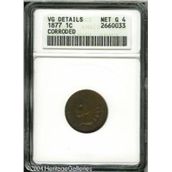 1877 1C --Corroded--ANACS. VG Details, Net Good 4. <B>1877 1C --Corroded--ANACS. VG Details, Net Good 4.</B></I> Deep sea-green and mauve hues envelop this glossy, slightly wavy, and intermittently granular key date Cent. A couple of pinscratches are on the right side of the wreath. All legends are clear except LIBERTY. <BR><BR><B>Important notice:</B> Heritage usually auctions material at the rate of 200-250 lots per hour. On some occasions eBay Live bid software or the Internet may not be able to keep up with the pace of the auction. We recommend placing a realistic absentee bid now as insurance to avoid disappointment. Occasionally the auctioneer may eliminate or reject an eBay Live bid, and the auctioneer may also reopen a lot after the close of the eBay live bidding (usually because we missed an audience bid), and may reject your bid even if it shows you as the winning bidder. By bidding via eBay Live, you agree that Heritage may award the lot to another bidder at its sole discretion under the circumstances described above or any other reasonable circumstances. Since eBay bids are not shown to us until we open the lot on the floor, we treat those bids just like floor bids. In most cases the floor responds before the eBay bid is presented to us, due to Internet lag time, so for consistency we have made it a policy that floor bids are always considered first over tie eBay live bids. Also please note that all Heritage lots purchased through eBay Live carry a 20% Buyer's Premium. Please make sure you read the Terms and Conditions before you bid. This lot is being auctioned in conjunction with a live floor auction by Heritage Galleries & Auctioneers. All final auction and invoice information will be supplied by Heritage Galleries & Auctioneers, and all other information should be considered preliminary. Lot:5084