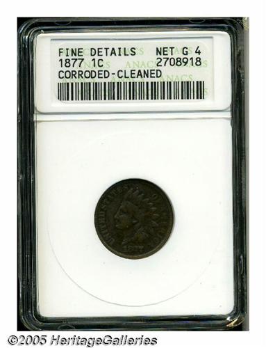 <B>1877<1C>--Corroded, Cleaned--ANACS. Fine Details, Net Good 4.</B></I> All legends are clear on this low mintage series key, but the walnut-brown surfaces are consistently micro-granular, and a horizontal pinscratch crosses the portrait. The cheek is bright from a mild cleaning.