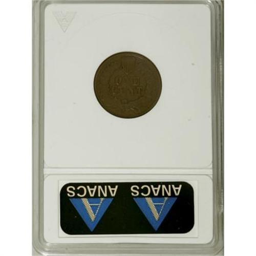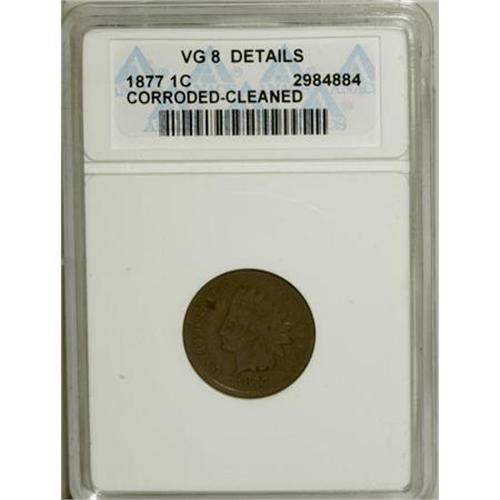 <B>1877 1C --Corroded, Cleaned--ANACS. VG8 Details.</B></I> This chocolate-brown key date cent shows little evidence of a past cleaning, but the obverse border has four small spots, one of which is beneath the 77 in the date.<BR><BR><b>Shipping:</b> Coins & Currency (<a target="_blank" href="http://www.heritageauctions.com/common/shipping.php">view shipping information</a>)