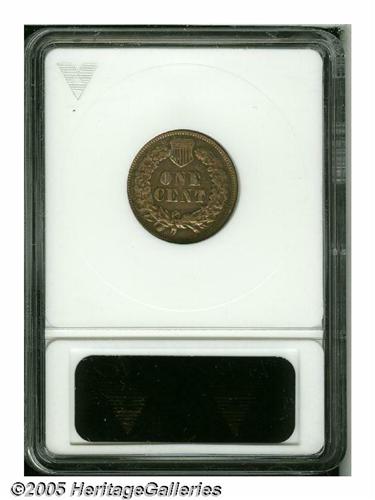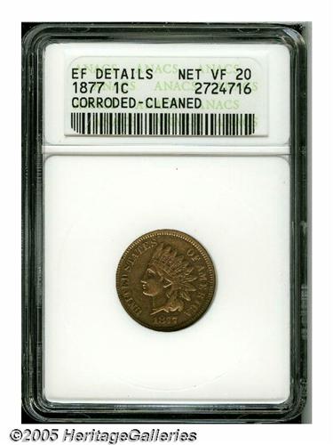 <B>1877<1C>--Corroded, Cleaned--ANACS. XF Details, Net VF20.</B></I> Artificial straw-gold color dominates this bright and hairlined rare date Cent. Traces of powdery gray debris are noted in protected areas of the reverse.